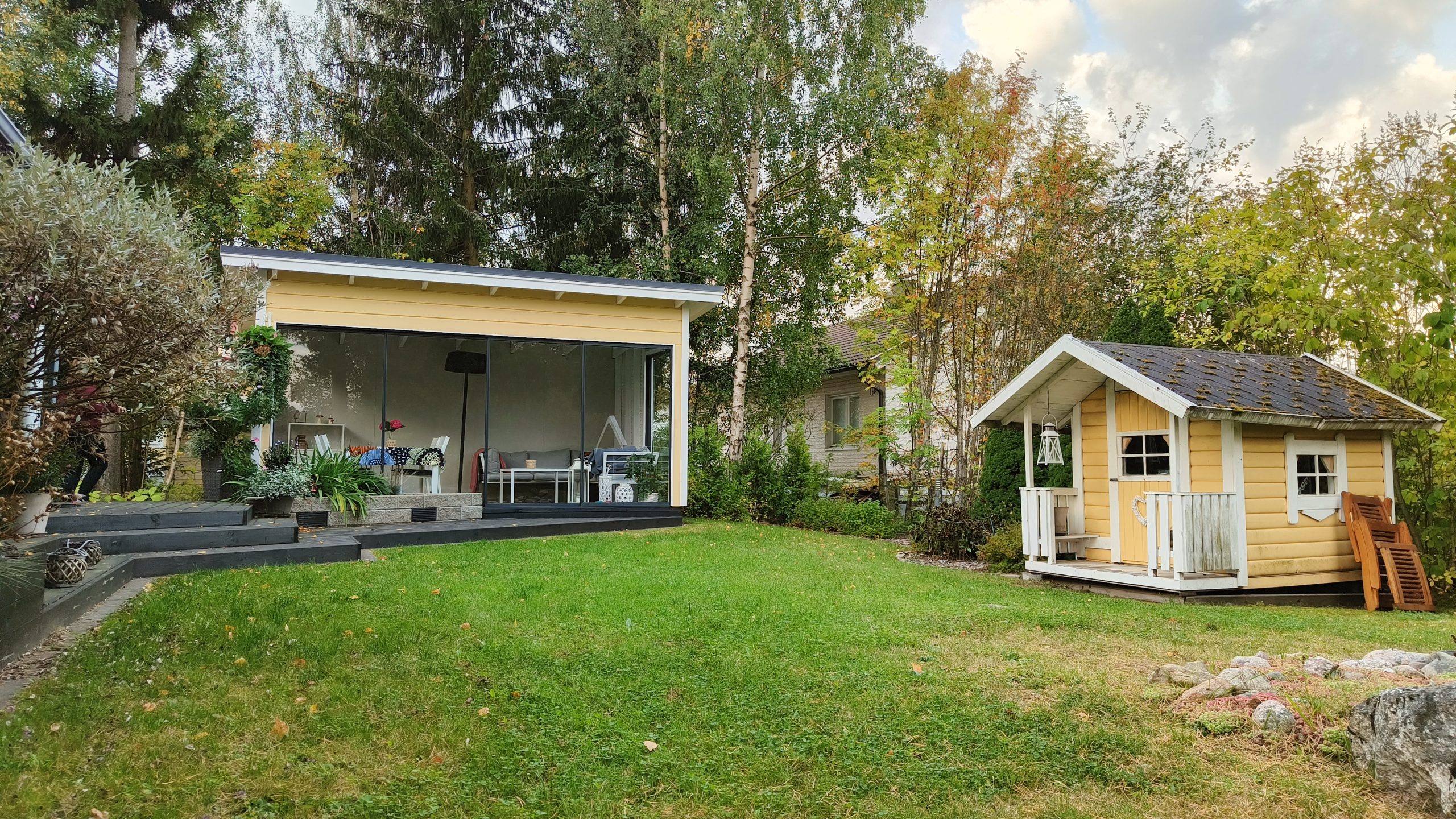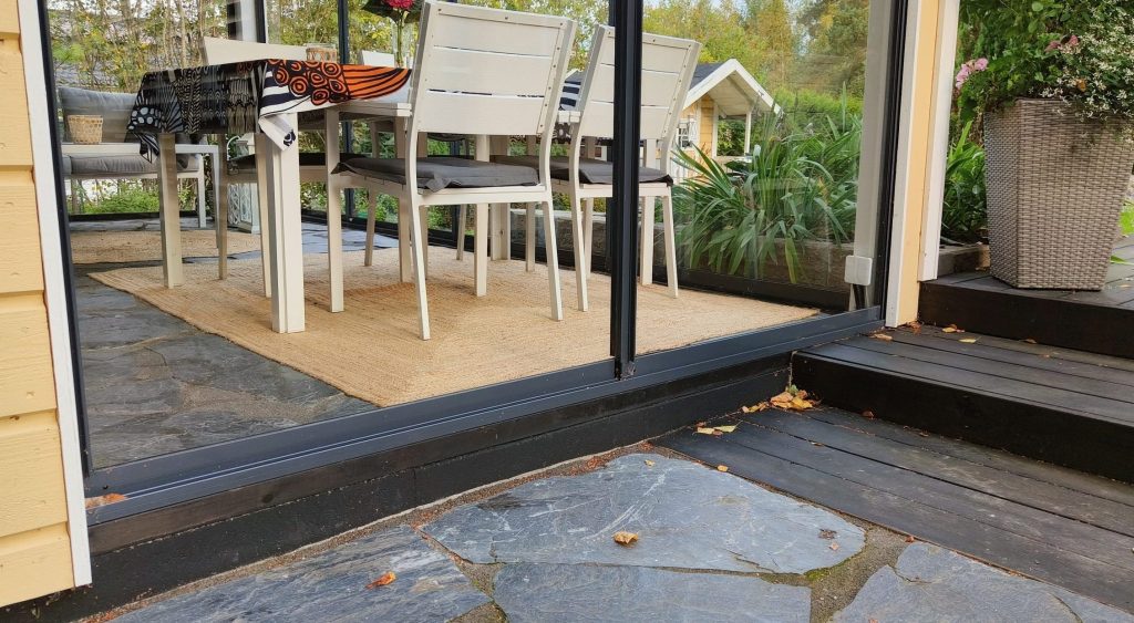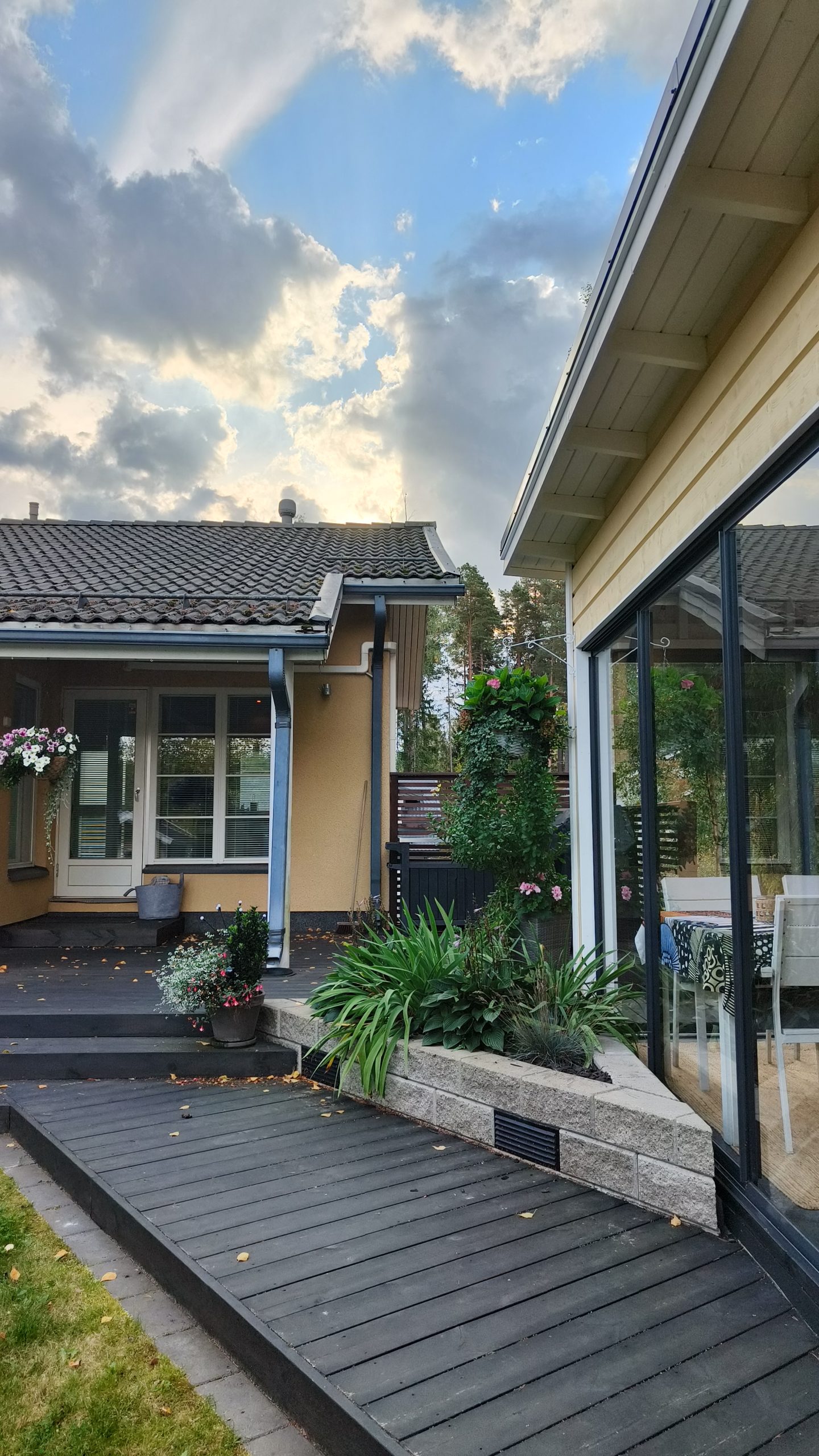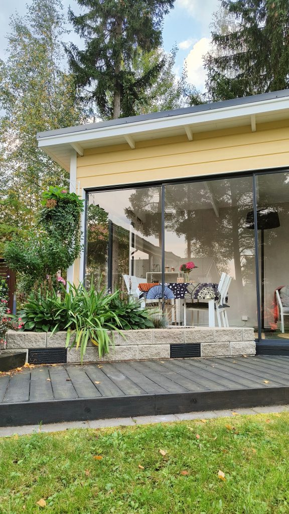 Takapihalle toivottiin uutta terassia ja tilaa oleskeluun. Uuden terassin yhteyteen tehtiin istutusaltaita, asennettiin poreallas ja rakennettiin lasitettu kesähuone. Kesähuoneeseen sekä takapihan kulkureitille tehtiin liuskekiveykset kovitesaumalla.