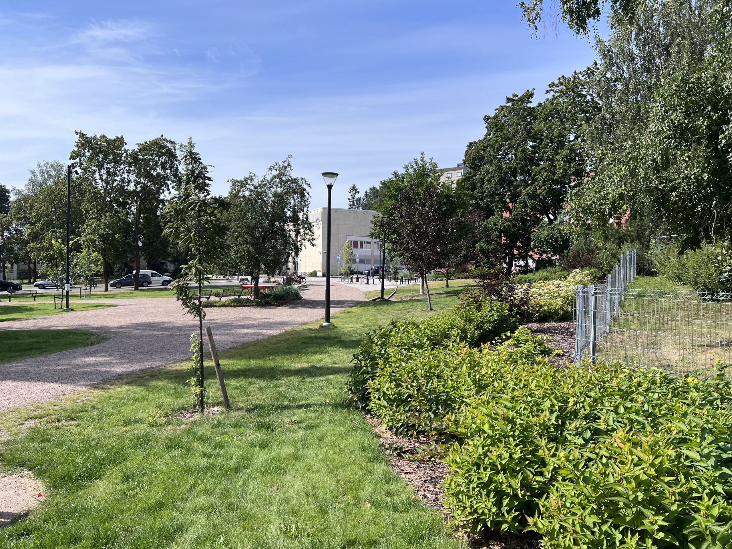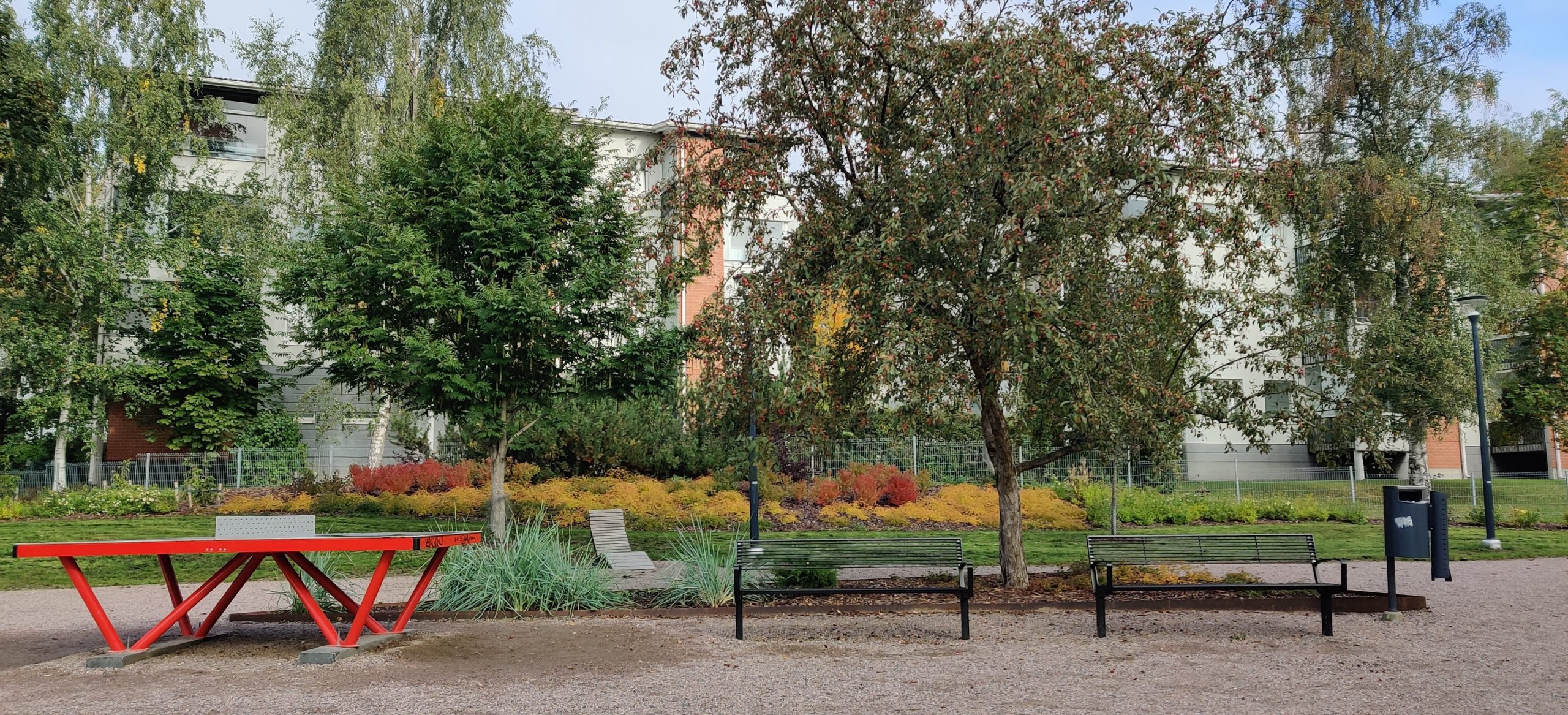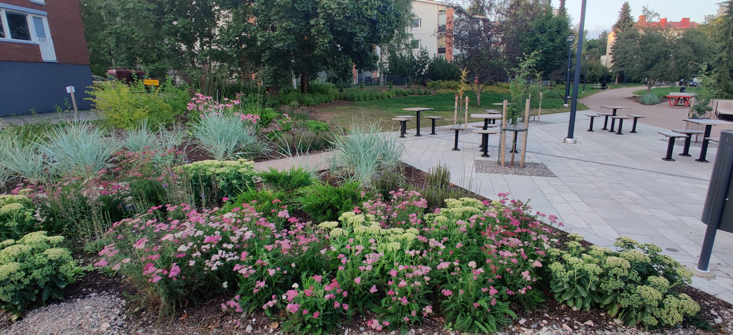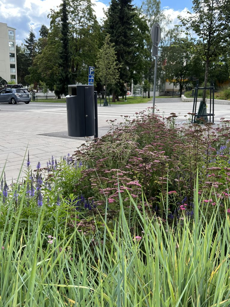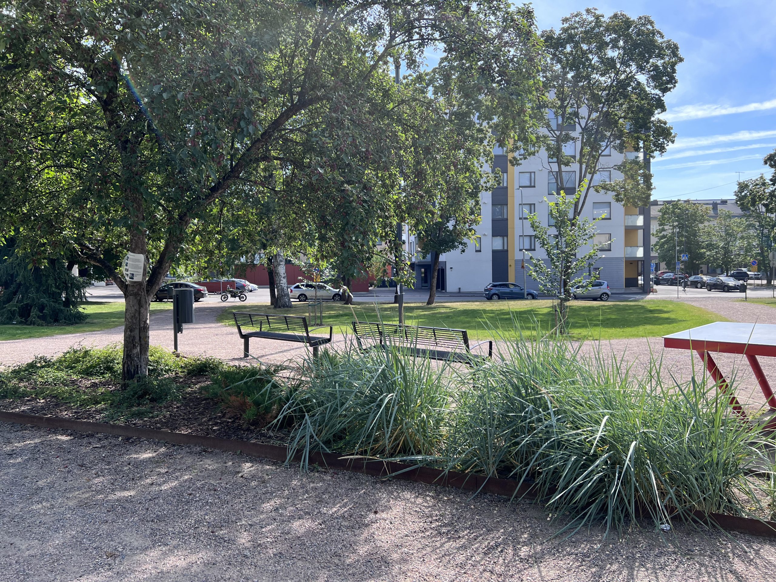 Lounaspuiston huonokuntoinen puusto poistettiin ja puistoon istutettiin uutta kasvillisuutta rajaamaan puistoa sekä tuomaan suojaa puiston vieressä sijaitseville kiinteistöille. Puistoon suunniteltiin eri korkuisia ja värisiä kasvilajeja, joiden kukinnot ja syysvärit muuttavat puiston ilmettä eri vuodenaikojen mukaan.