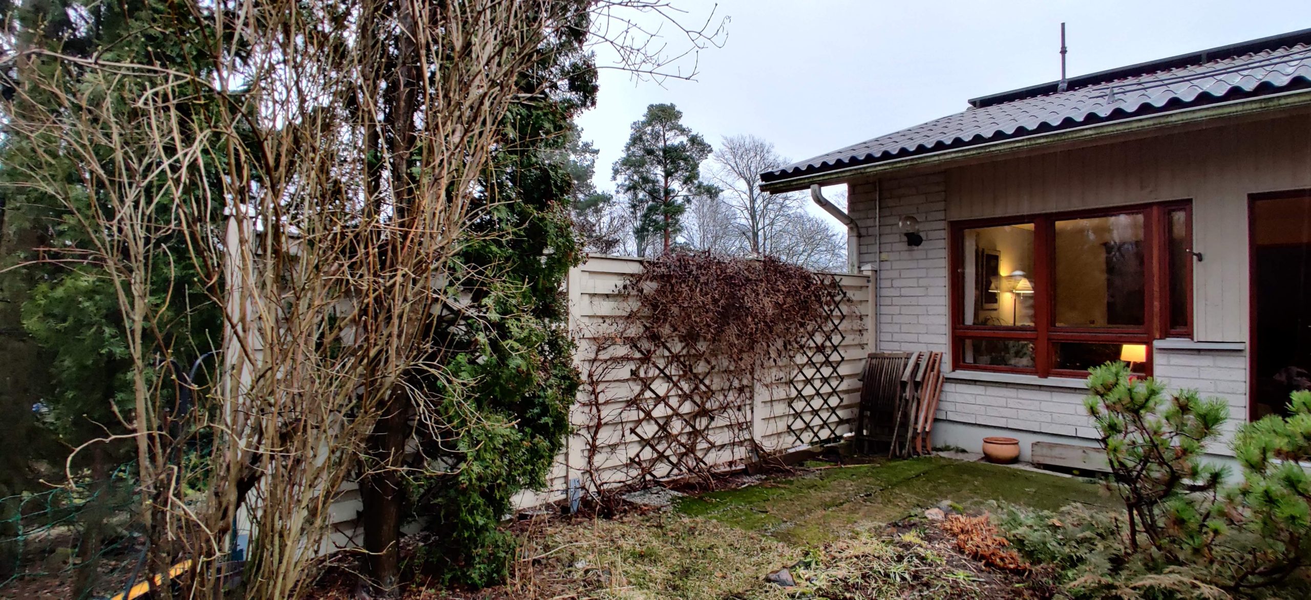 Auringon suojaksi rakennuksen seinälle asennettiin markiisi. Perheen koiraa varten asennettiin verkkoaita pihan reunoille.