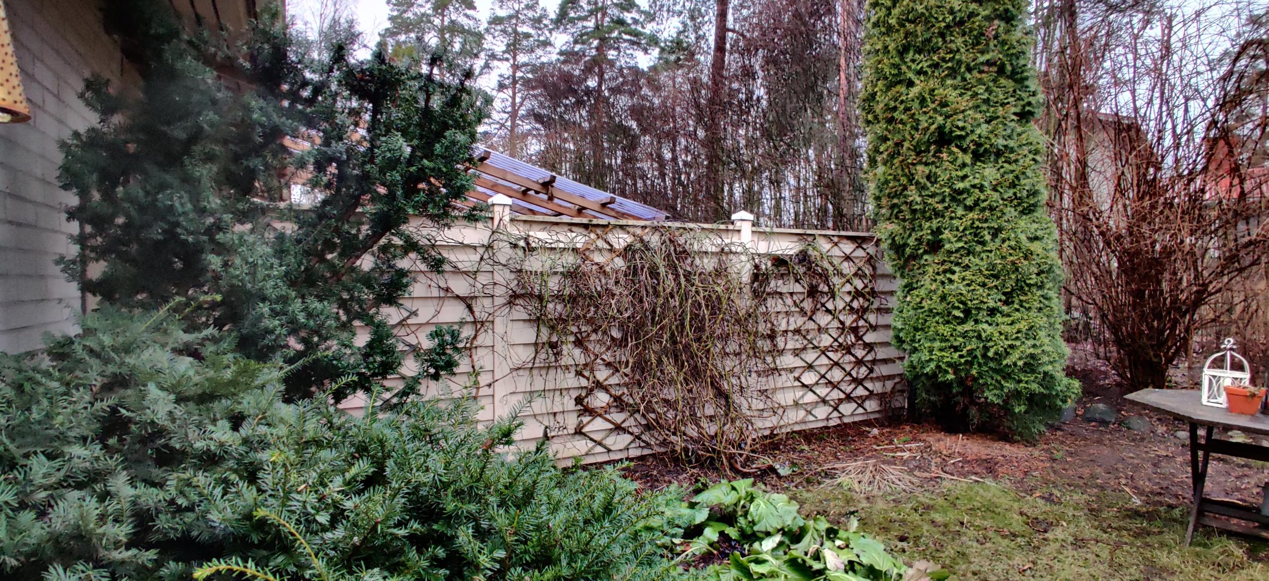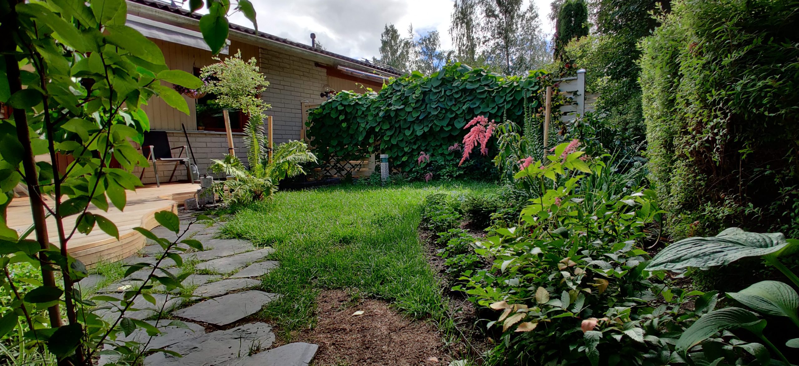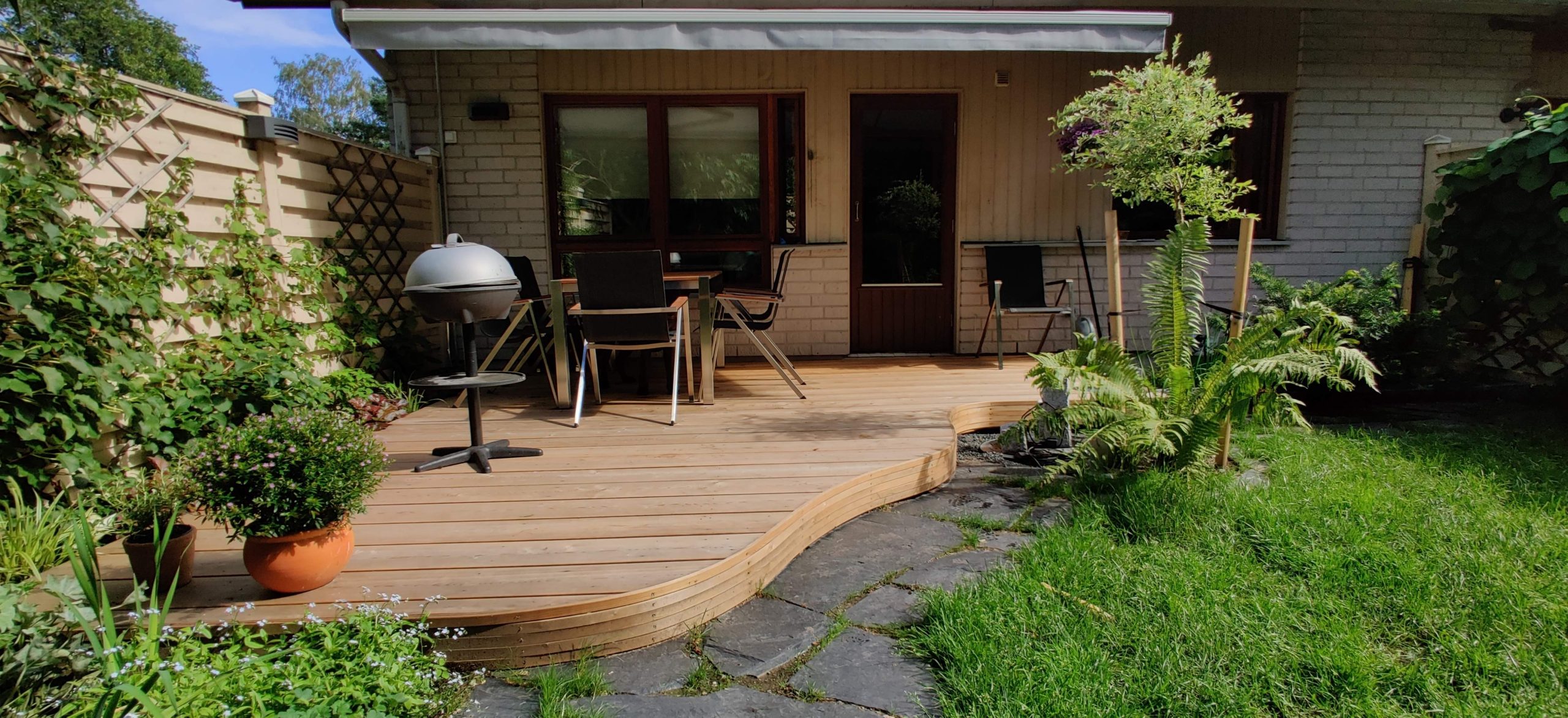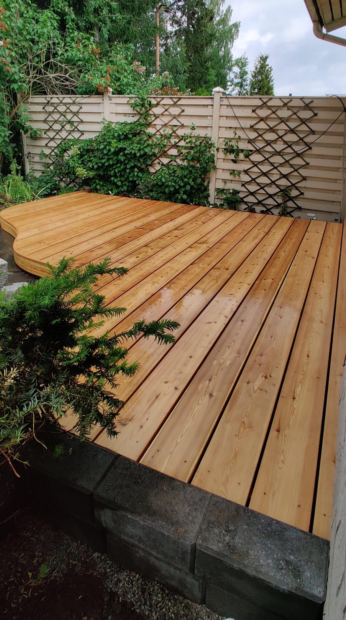 Takapihalle suunniteltiin uusi terassi, jonka materiaaliksi valikoitui 190 mm leveä lehtikuusilauta. Terassin reunaan sahattiin kaareva muoto. Terassin ja aidan väliin tehtiin istutusallas, jossa säilytettiin olevat köynnökset tuomaan vehreyttä pihojen väliselle aidalle.