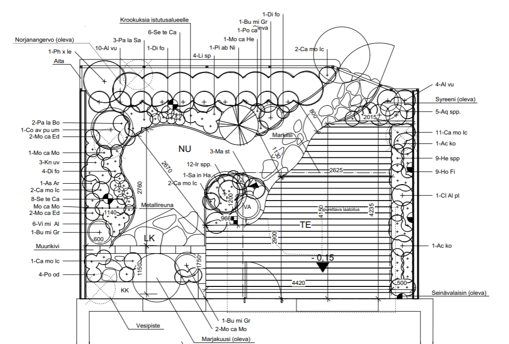 Terassin edustalle asennettiin liuskekiveys, jonka yhteyteen sijoitetiin vesiaihe istutusalueelle. Kasveiksi valikoitui hakuropaju, kotkansiipi, kurjenmiekka ja japaninsara.